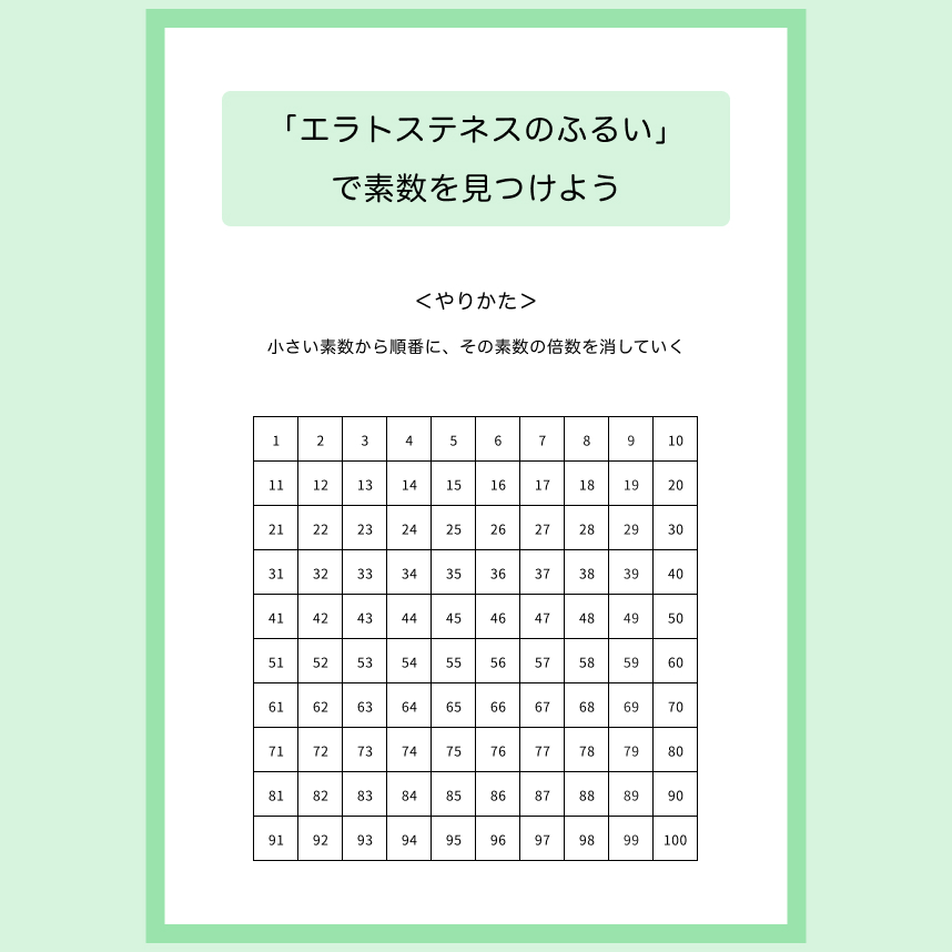 エラトステネスのふるいとは、「素数の約数は1と自分自身の2つのみ」という性質を利用して素数を見つける方法です。